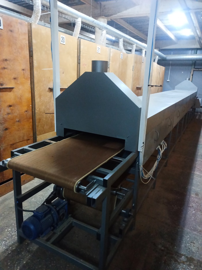 Выполнена на тефлоновой ленте с бортиками, может быть переоборудована на цепной транспортер или металлический сетчатый транспортер.